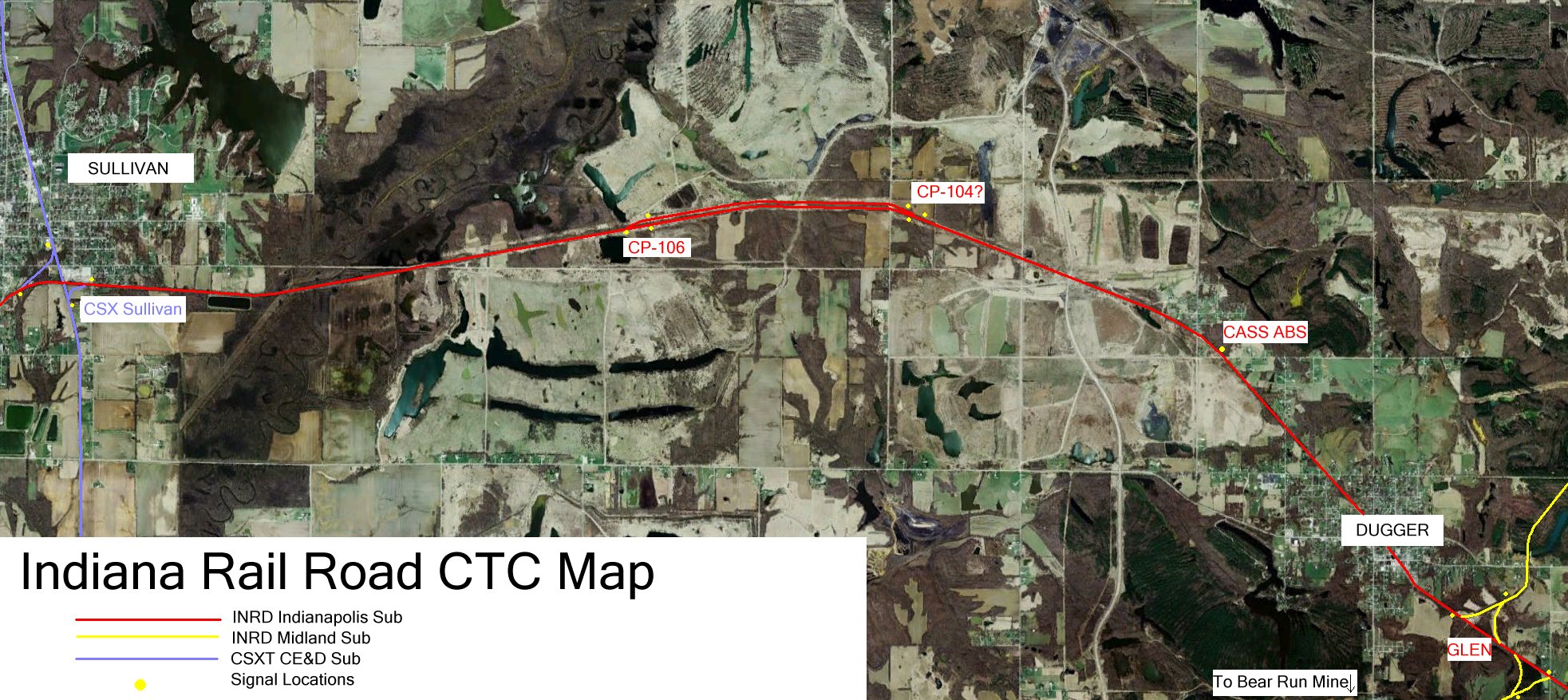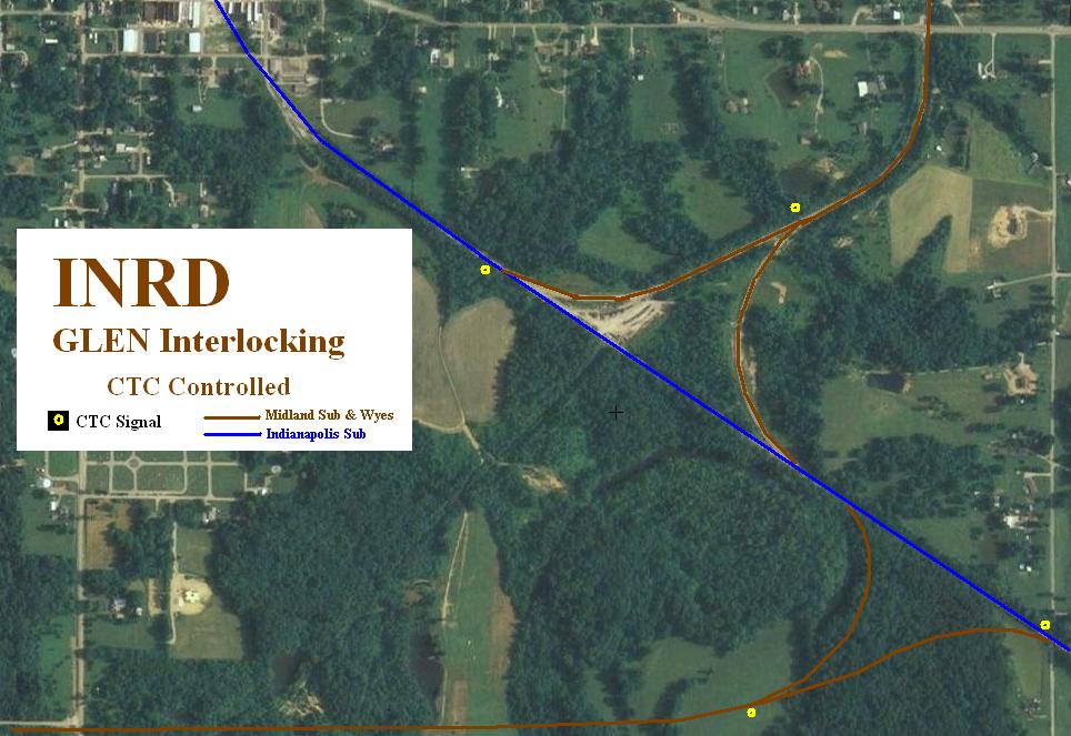 Glen Interlocking may be the most important interchange on the line. This is just east of town of Dugger. It was built in two stages to connect to the rebuilt Midland Sub. The first stage was constructing a wye to connect to the portion of the Midland Sub north of the Indianapolis Sub. This was at first simple hand thrown switches, INRD would dispatch a switchtender to throw the switches. Later some radio controled switches were installed. When the Midland Sub was extended south, another wye was installed to the south to connect to the extended line to Bear Run. All the radio switches were removed and a full blown CTC interlocking was installed.
