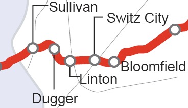This section of the former IC line is known primarily for two things, interchanges and coal fields. After coming out of the high woodlands near Bloomfield the line crosses the White River at Elliston the line immediately changes character, The woods give way to a flat rolling plain, part of the white river valley, Before changing into highly disturbed coal lands, with short scrub trees and countless old slag piles. Finally arriving at the Wabash river valley another plain is found.