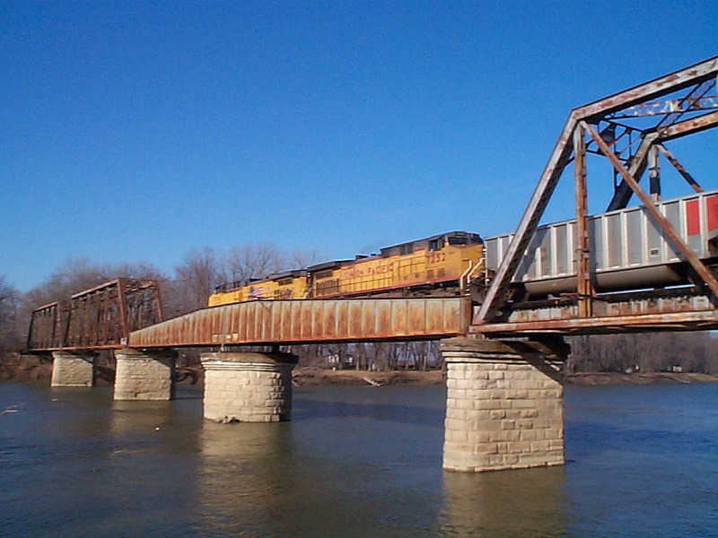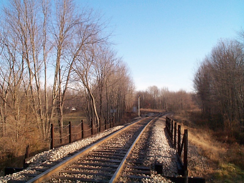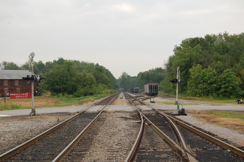 Moving back to Elliston, this is a small town on the shores of the West Fork of the White River. The line passes over the town on a steel bridge approach. You will note one section of this approach that once was made to bridge over something, but is now long gone. This was once a famous triple crossing, a diamond once sat under the bridge where the former Monon crossed the New York Central. Both lines are long gone however but the bridge remains.