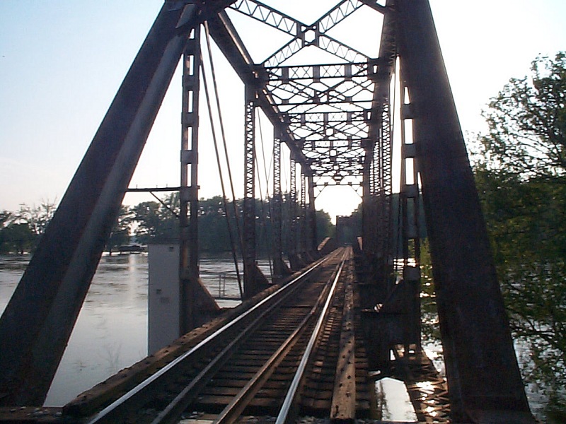 The last place in our study of this area is Riverton, the last town in the line in Indiana. It is the site of an unusual bridge. In that it was designed as a swing bridge at a time that boat traffic was envisioned for the Wabash River. The boat traffic never developed and the bridge is permanently shut, with strips of ribbon rail over the bridge.