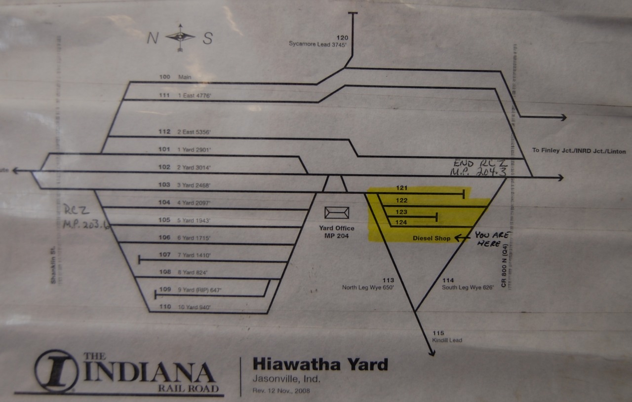 Just south of the town of Jasonville, you will find Hiawatha yard, which is it’s new name. The CP/SOO/MILW name was Latta yard, supposedly named such due to the farmer which owned the land the yard lays on before the railroad. Hiawatha is the main classification yard for the INRD. It is here that cars are blocked for travel Louisville, Indianapolis, Palestine, Terre Haute, Chicago, Bedford, or ISRR interchange. The yard is also the site of the primary engine servicing facility for the road. Everything except for traction motor and wheel work is done here. The facility itself is an old brick structure dating from the early MILW days, the shed for the shop is a former MILW baggage car. Near the shop is a full wye which connects to a branch currently used to store cars, The wye itself is often used to turn locomotives. On the south end of the yard is the connection to the INRD Midland sub, the primary way used to access the INRD Indianapolis Sub.
