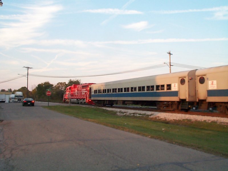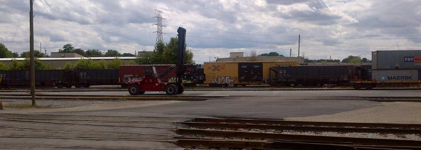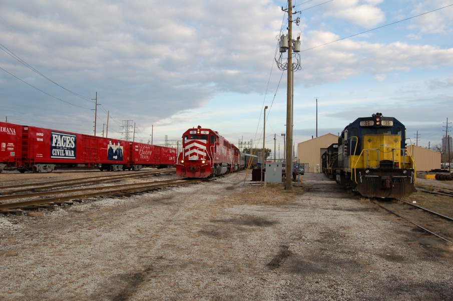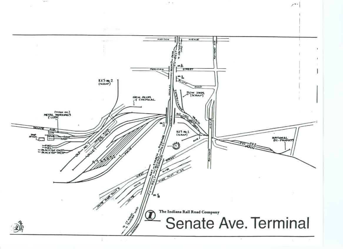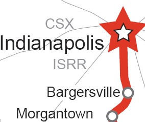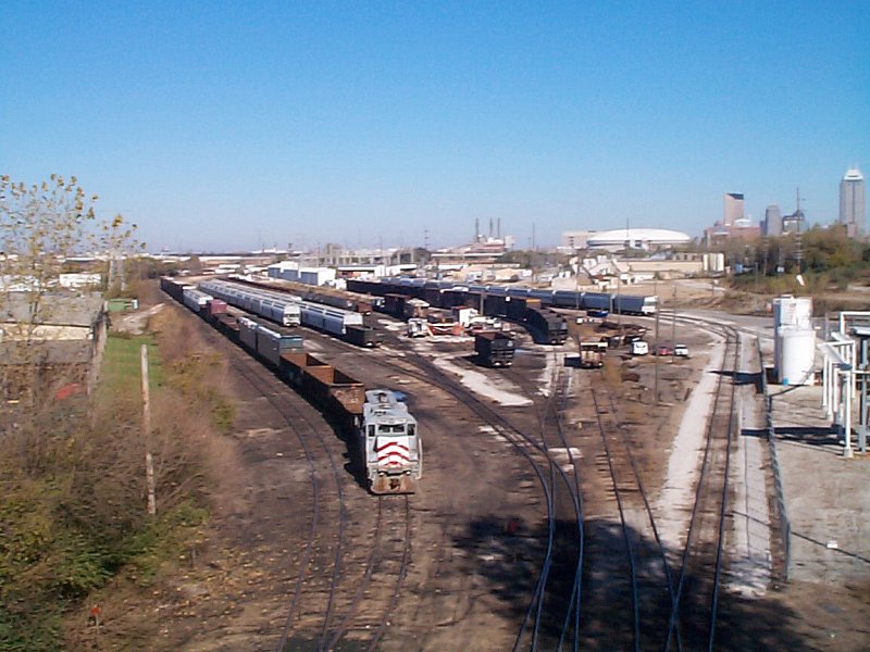 Beginning at Senate Avenue Terminal, you will find a cramped yard amidst the industrial south side. This is home to a small mechanical shop, the burgeoning Indiana Reload Center, and the yard tracks where trains are broken up and made. Just to the south of the yard, where West street crosses the line you will find the steep connection to the maze of trackage that is the CSX Indianapolis Terminal, which includes the Indianapolis Union Belt. This connection is a serious operating challenge with its 3% grade and S curve. Heavy trains will often have to back up and run at the hill. For this reason the connection and yard tracks on the main are kept in tip top shape. It is quite a show when one of transfer moves storms the hill with a lashup of GP38 types. Just to the south of west street you will find two former interchange tracks, IU1 and IU2, now used as yard tracks. Further south you will find the wye to the IP&L Harding Street generator, formerly called the Stout generator. Just south of Hanna avenue is the beginning of recently constructed Dixie siding. This long siding is used to stage trains for moving south without having to clog the cramped yard tracks in the terminal